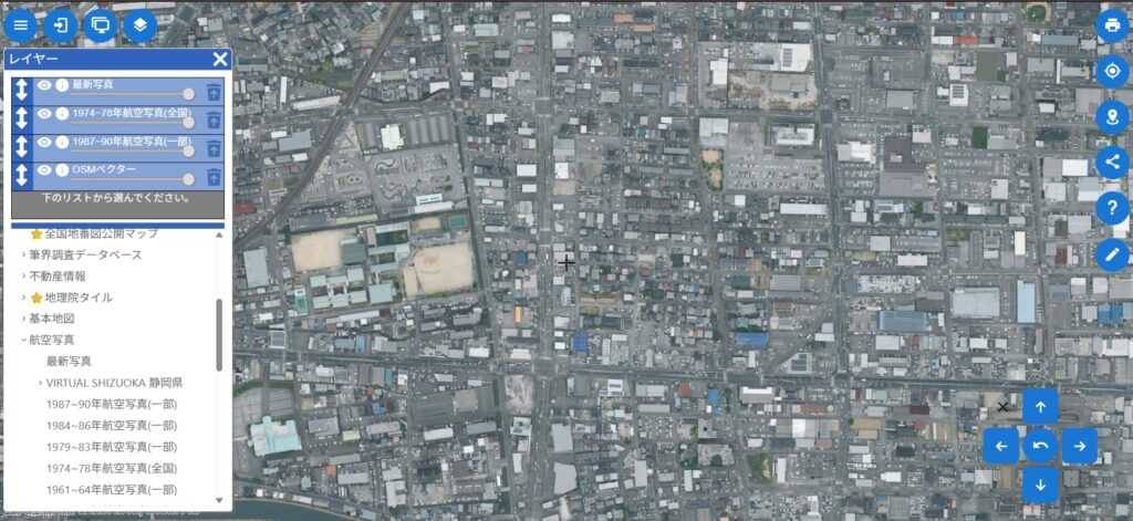 古い航空写真を表示できるので、「ここは昔は田んぼだったんだ!」といった発見ができます。